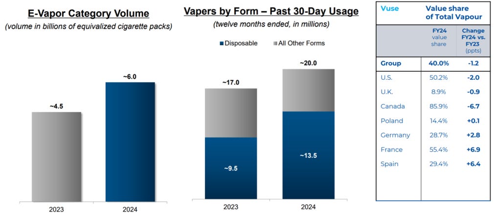 The real prize remains the US, which accounts for over half of global vapor sales. If regulatory enforcement strengthens as expected in early 2025, Vuse could recover meaningful market share from the $10 billion total vapor market.