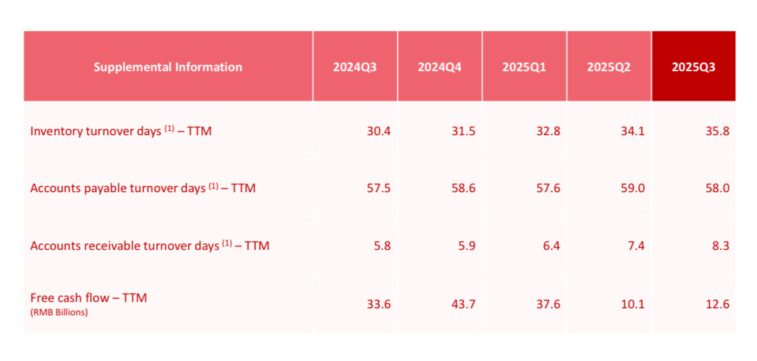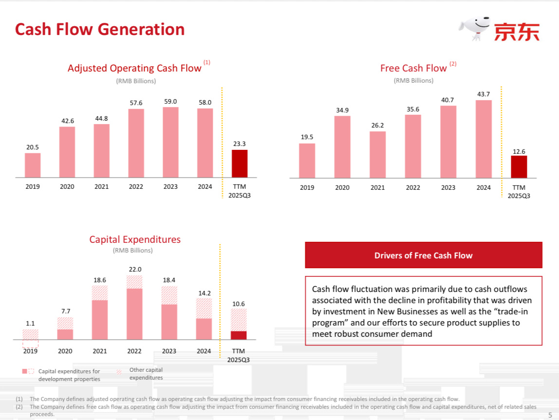 Free cash flow (TTM): about RMB 12.6 billion, far below the 30–40 billion JD used to generate.