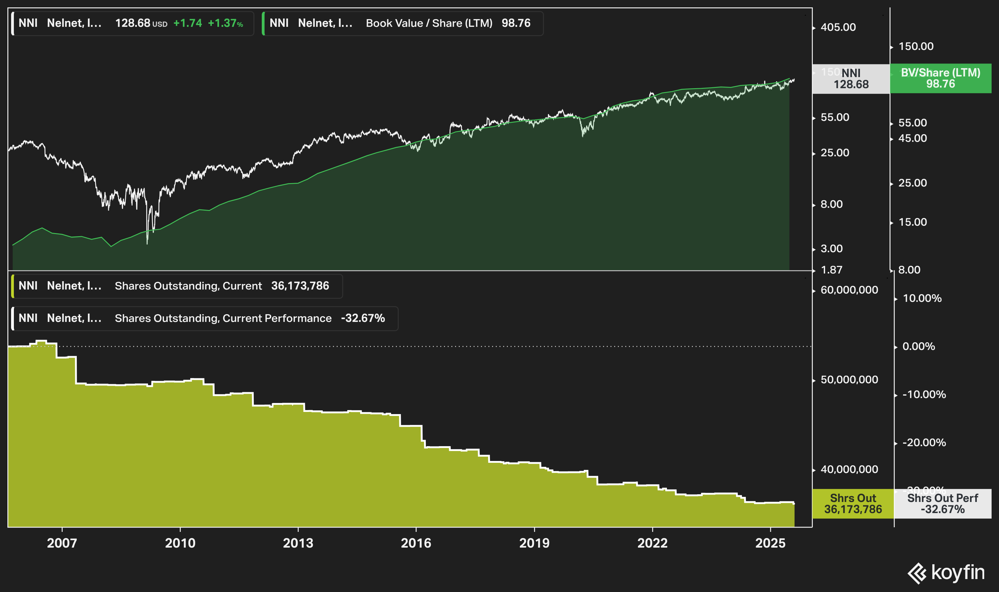 Over time, that combination has steadily driven book value per share higher while also returning capital to shareholders through buybacks and dividends.